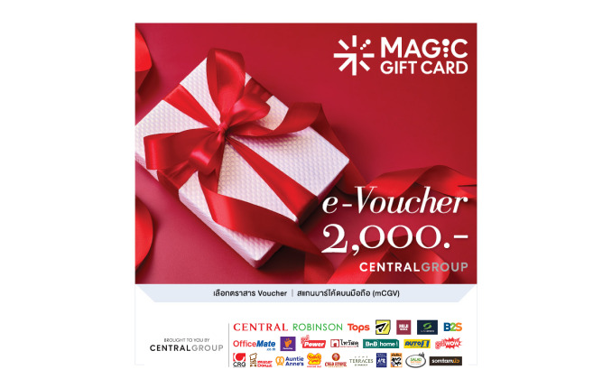 2. This e-card can be used at Central, Robinson, Tops, Tops Food Hall, Tops Fine Food, Eathai Market Zone, Matsukiyo, Power Buy, GoWow, GoPower, SuperSports, B2S, OfficeMate, Thai Watsadu, BNB Home, Auto 1, Marks & Spencer, MUJI, and at participating restaurants under the Central Restaurants Group, according to the value on the e-card and as indicated on the e-card (excluding leased shops, food court areas, and online channels)