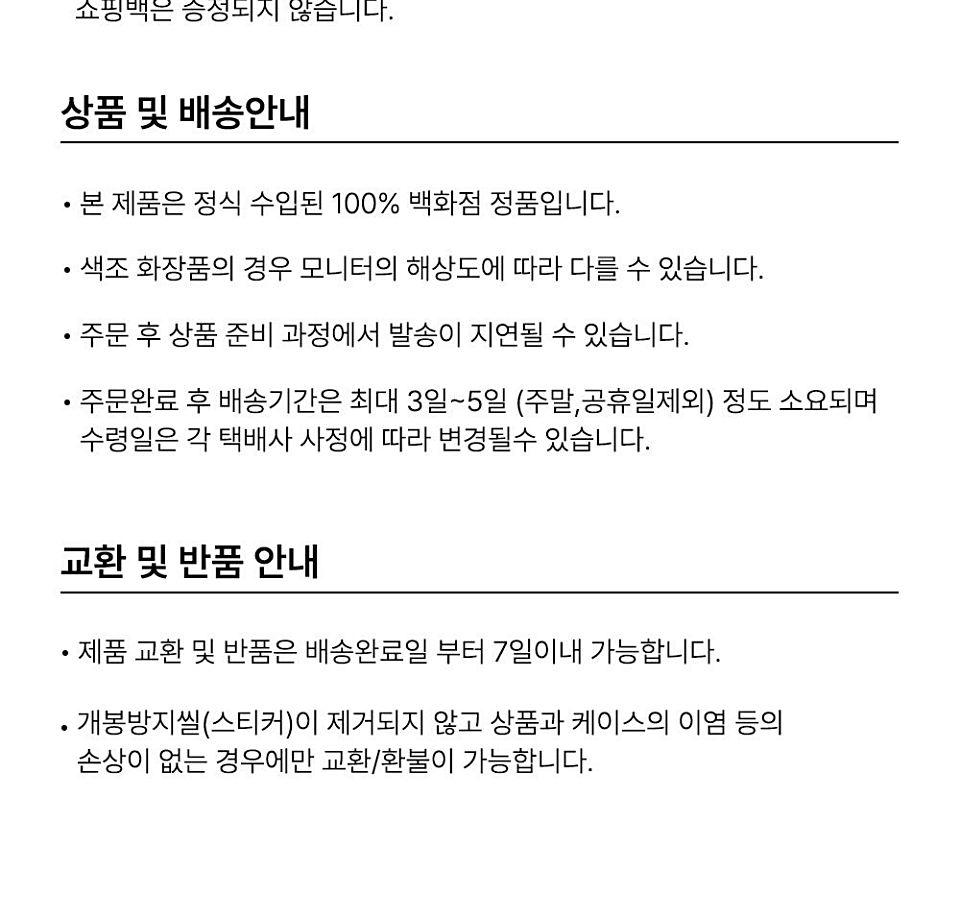 • 配送は、支払い及び配送情報の入力完了日から営業日基準で平均3-5日以内に完了されます。(週末、祝日除く)注文量が多い場合、時間がもう少し掛かる場合があります。