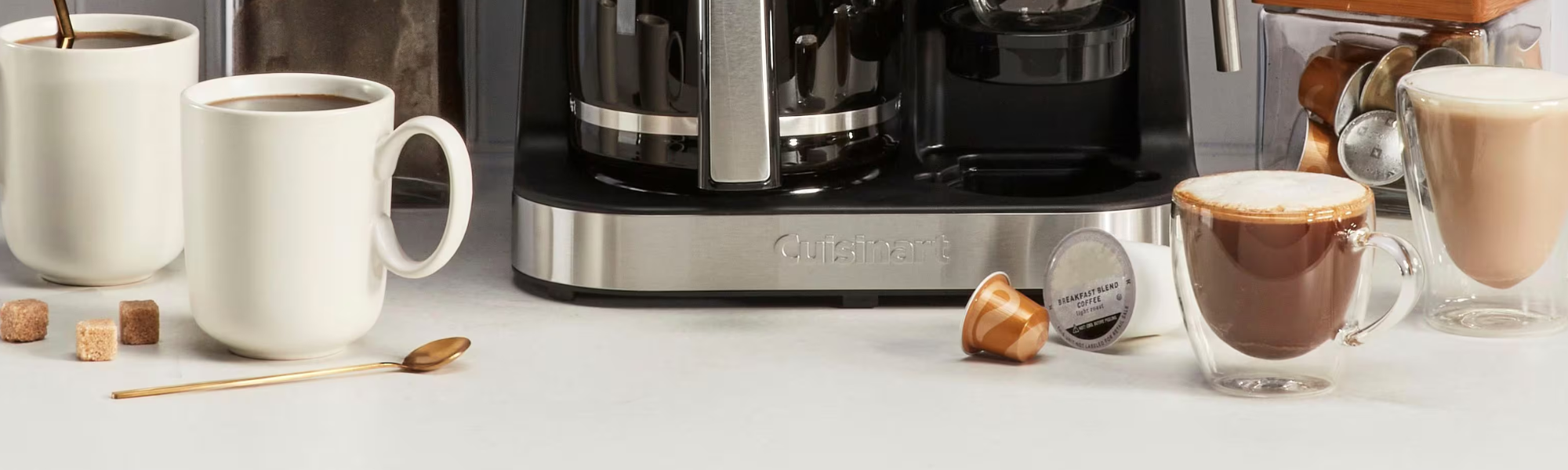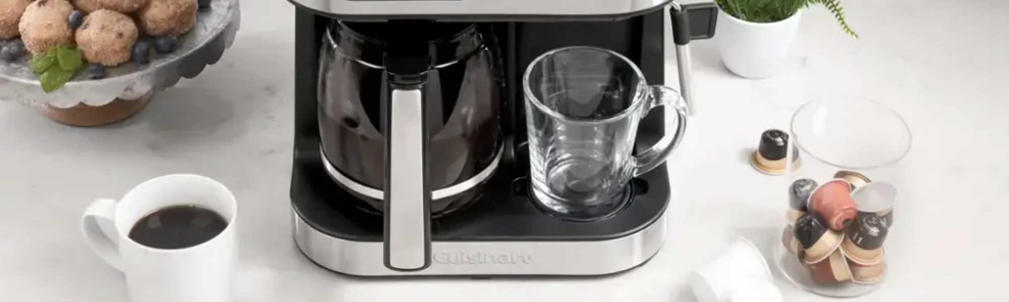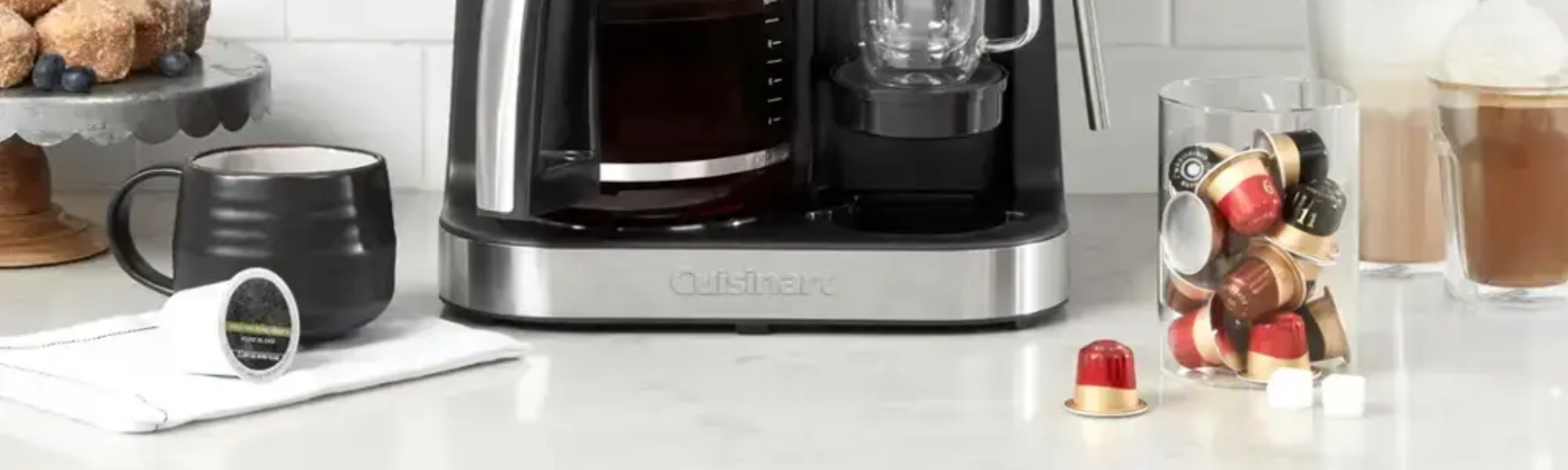 クイジナート コーヒーセンター・バリスタバーでカフェ体験をご自宅に。コンパクトな利便性とともに、4つの抽出オプションをお楽しみいただけます。時間・温度・濃さを設定可能で、淹れたてのコーヒーを最大12杯、ご友人やご家族に完璧な抽出で提供できます。あるいはシングルサーブカップでお一人分を。6、8、10オンスのサイズに対応し、数分で抽出。大半のシングルサーブ用ポッドと互換性があります。より力強い風味には、ネスプレッソ オリジナルライン式カプセルをセットし、エスプレッソのシングルショットまたはダブルショットをお楽しみください。スチームワンドで泡立てたミルクやスチームミルクを作り、カプチーノ、ラテ、その他お好みのスペシャルドリンクの幅を広げます。ワンドはお茶、抹茶、ホットシリアル、スープ用の熱湯を注ぐのにも最適です。