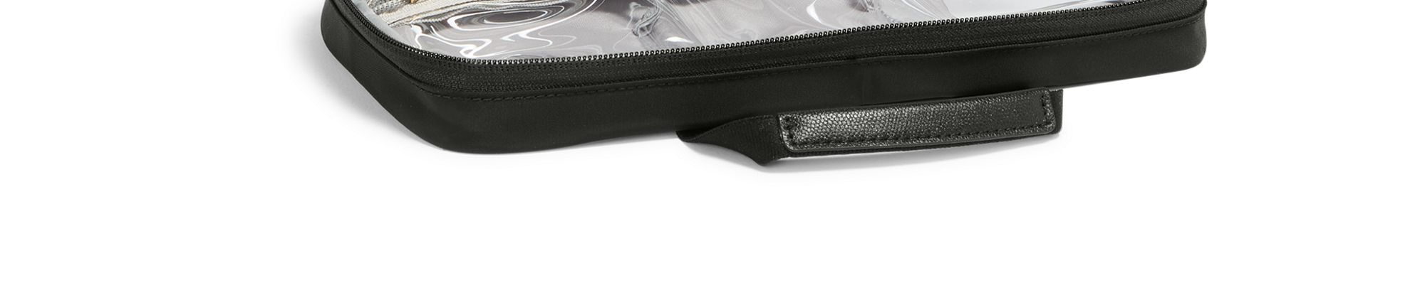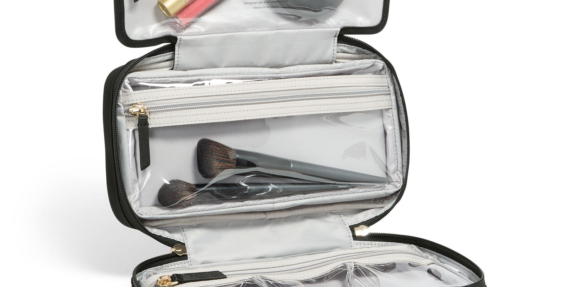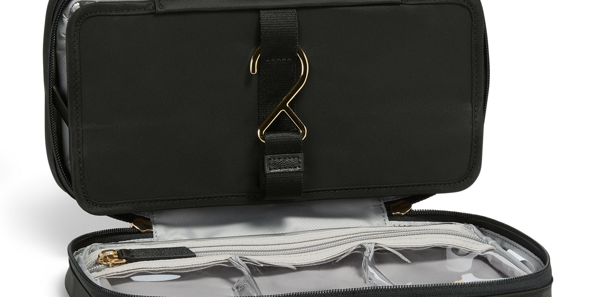象徴的な旅行用マデリンを小型化したモデルで、このバージョンは小さなサイズでも整理を最適化できるよう、3つの透明な収納スペースを備えています。開いた状態では、平らに置くことも、器具に掛けることもできます。