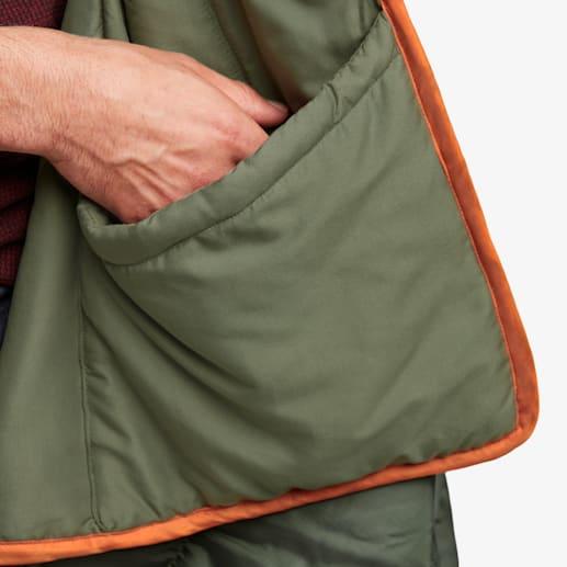 耐久性と撥水性に優れた素材で作られており、ドローストリング付きのフードと多数のポケットを備え、瞬時に包み込むようなブランケットに変わります。