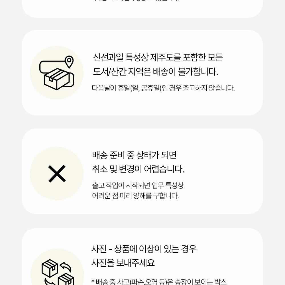 • 배송은 결제 및 배송 정보 입력 완료일로부터 영업일 기준 평균 3-5일 이내에 완료됩니다. (주말, 공휴일 제외) 주문량이 많을 경우 시간이 조금 더 소요될 수 있습니다.